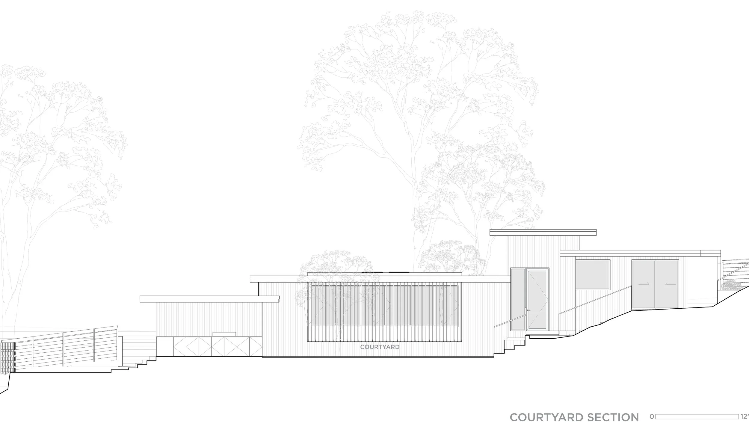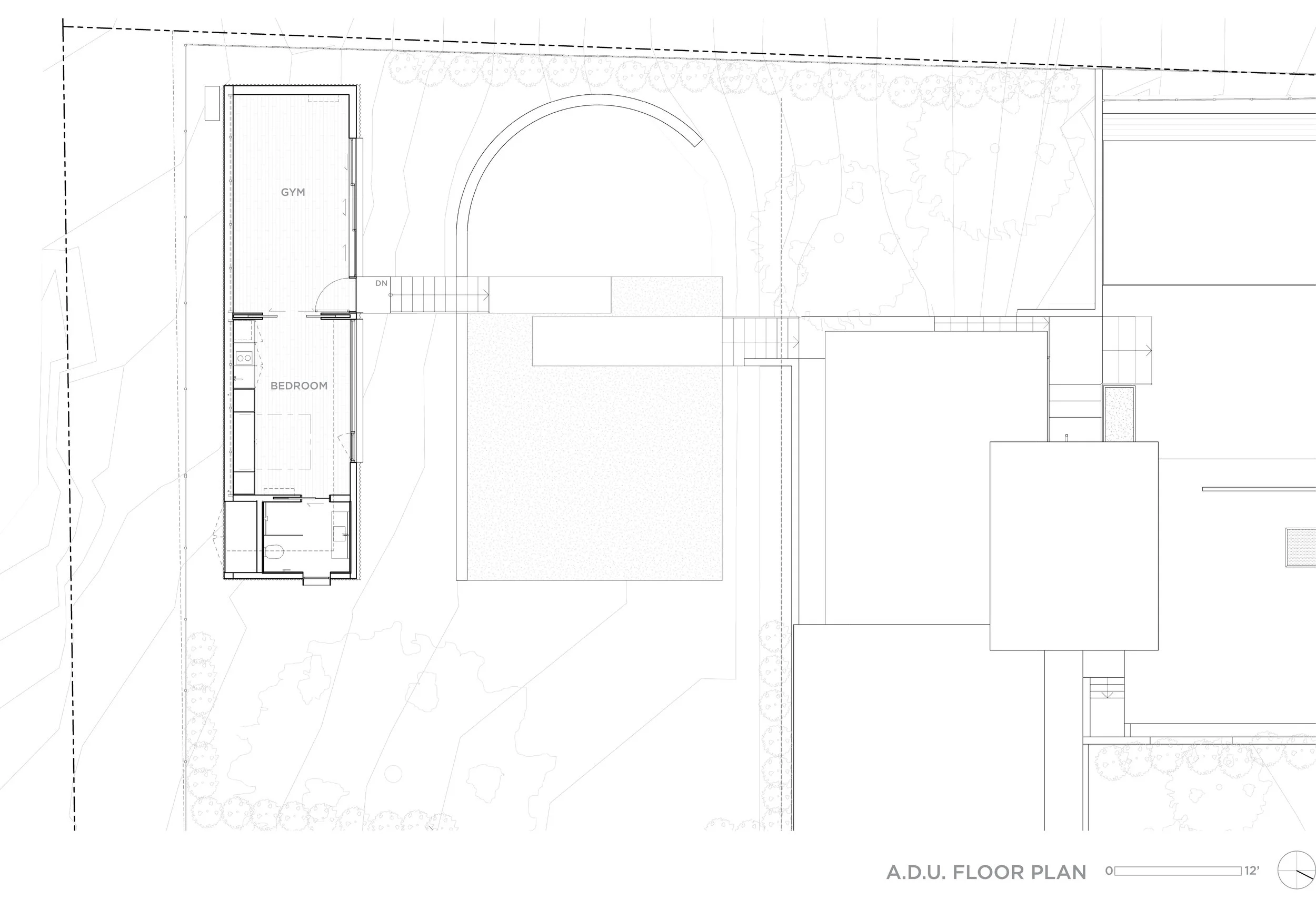 The upper portion of the site, previously underutilized, is transformed with a new ADU, fire pit, and flat landscaped area, each oriented toward distant views and directly connected to the courtyard.